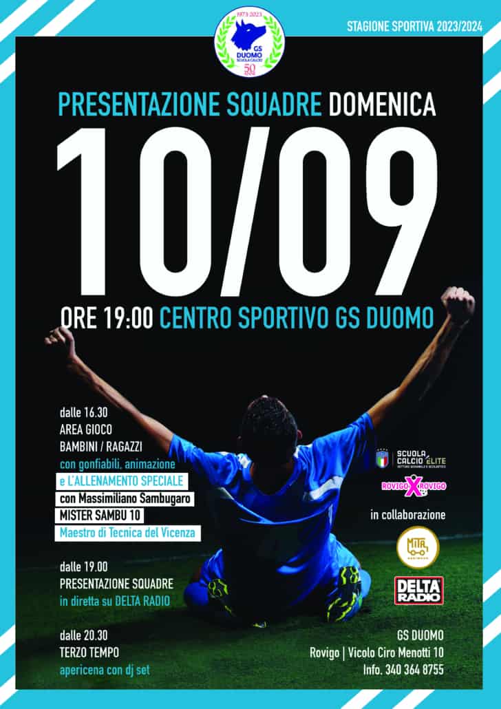 Il Gs Duomo è lieto di annunciare che Domenica 10 settembre si terrà la presentazione ufficiale della stagione 2023/2024 con la partecipazione di tutte le categorie; dai “Primi calci” alla prima squadra che milita nel campionato di seconda categoria. Il programma sarà suddiviso in tre tempi con l’inizio delle attività dalle ore 16:30 con laboratori tecnici gestiti dall’ospite d’onore Massimiliano Sambugaro “Mr Sambu” maestro di tecnica del Vicenza, famoso influencer con oltre 200.000 follower su Facebook, noto per i suoi video con trick ed esercizi con il pallone ma soprattutto per la famosa sfida a Messi per la quale ha percorso 400 km palleggiando.