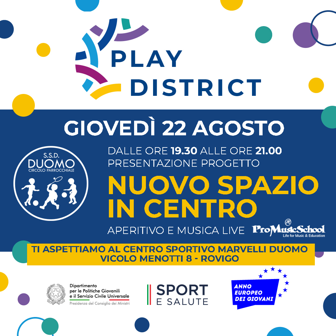 Giovedì 22 agosto alle ore 19:30, presso il Centro Sportivo Marvello si terrà la presentazione ufficiale del progetto “Nuovo Spazio in Centro”, un’iniziativa promossa dal Circolo Parrocchiale Duomo,finanziata da Sport e Salute, e pensata per coinvolgere i giovani tra i 14 e i 34 anni in attività sportive, culturali e sociali.